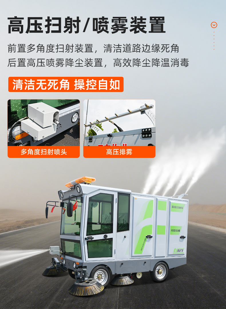 莱特LT-G86型全封闭四轮驾驶式扫地车,此车辆为纯吸款高性能车辆、无滚刷结构,使用效果更稳定。车辆具备智能语音系统,配备高压清洗和高压雾炮功能,清扫宽度2450mm,满电工作时间为3-5小时,工作效率30000㎡/h,采用的是特种车专用磷酸铁锂电池,配置长度4米可拆卸手持吸管,吸净率高,作业速度快。后置240L标准垃圾桶,收集满灰尘垃圾之后,可以直接更换垃圾桶,效率高,无需人工倾倒垃圾。高压雾炮射程可达10米以上,可对作业环境高效的降尘,还可以用于绿植养护和环境消杀。高压水枪可以对地面顽固污渍进行清洁,还可以冲洗路牙石,为绿植浇水,工作之余,还可以用高压水枪清洗车辆。应用场景为:厂区、车间、公园、街道、物业小区、码头、学校、机场等需要大面积清扫的区域区域。