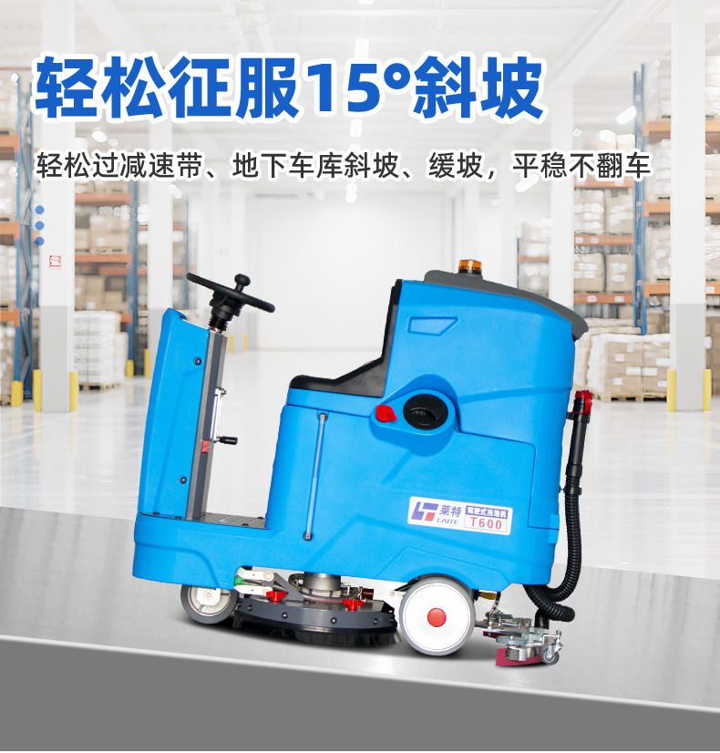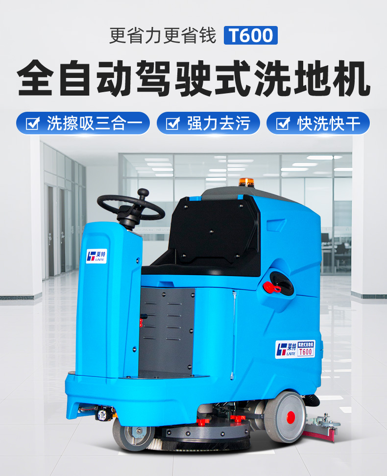 莱特工业洗地机T600型,机身尺寸:1370*800*1300mm,吸水扒宽度:1000mm,额定电压:DC24V,工作效率:3600m²/h,标配电池容量:100A,连续工作时间:3-4h,工作宽度:530mm,刷盘转速:150rpm,刷盘功率:550W,吸水功率:600W,行走功率:1000W,行走速度:0-7km/h,清水箱容量:90L,污水箱容量:100L,声级:60dB(A),整车重量:201kg。具备:全自动升高和降低刷盘、吸水扒;倒车自带吸水趴和刷盘升降功能;污水箱满了自动停机功能;配有水量显示器,可直观观察水位变化;电磁刹车装置,坡道上停车时不会溜车,更安全;采用双控制器系统控制整车电控,维修简单快捷;浮球滤网+传感器双重保护设计可防止污水进入真空电机;更轻便小巧,适用于较小的场所,可直接进出电梯,方便清洗不同楼层;两个注水口设计:大注水口可实现快速注水,小注水口适用于远距离注水;污水箱易清洗。静音设计,适用于对声音敏感的环境,如办公场所,医院;吸水扒易装卸,遇到障碍物时自动脱落,可保护吸水扒,帮助机器顺利通过。